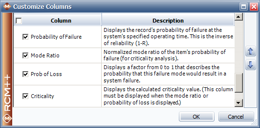If you wish to perform a quantitative criticality analysis, the software can calculate the probabilities of failure and use that information to calculate the criticality. Before you can calculate the criticality, you must make sure the applicable criticality analysis fields have been enabled for the project. To see the calculated values, make sure the four columns shown next are selected in the Customize Columns window, which you can access by right-clicking any of the column headers in the FMRA.