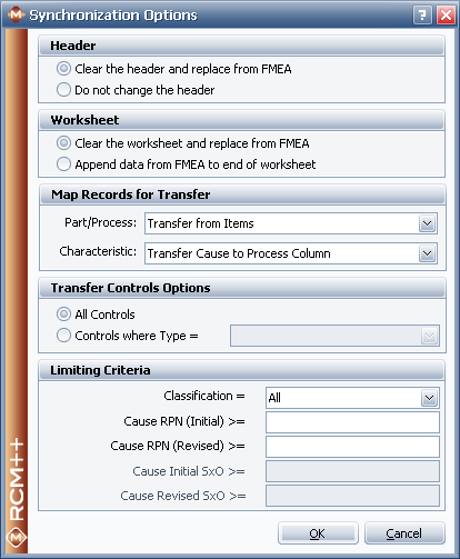 In the Worksheet area, select whether to replace all of the information in the Worksheet tab of the control plan with data from the associated FMEA or append the FMEA data to the end of the existing data in the worksheet.