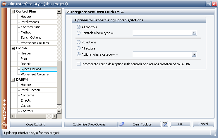 The following options are available on the DVP&R > Sync Options page of the interface style when you select the Integrate New DVP&Rs with FMEA check box, as shown next.