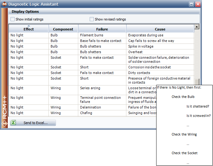 Starting in version 9.0.2, the Diagnostic Logic Assistant window makes it easy to extract relevant data from the FMEA into Microsoft Excel, where you can organize and filter it as needed when preparing supporting documentation. To access the utility, choose Home > Reporting > DLA.