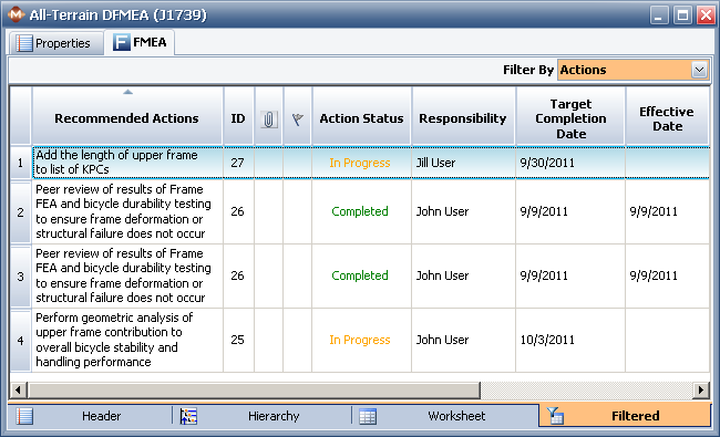When working in the FMEA, you can use the filtered view to show only records of a specific type (e.g., functions, failures, etc.). To use the filtered view, click the Filtered tab at the bottom of the Analysis panel. You can then choose the record type that you want to view from the Filter By drop-down list in the upper right corner. The Analysis panel will change to display only the records of the specified type, as shown next for recommended actions.