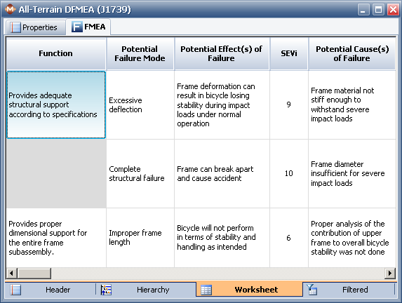 To view the FMEA in a tabular format, click the Worksheet tab at the bottom of the Analysis panel.