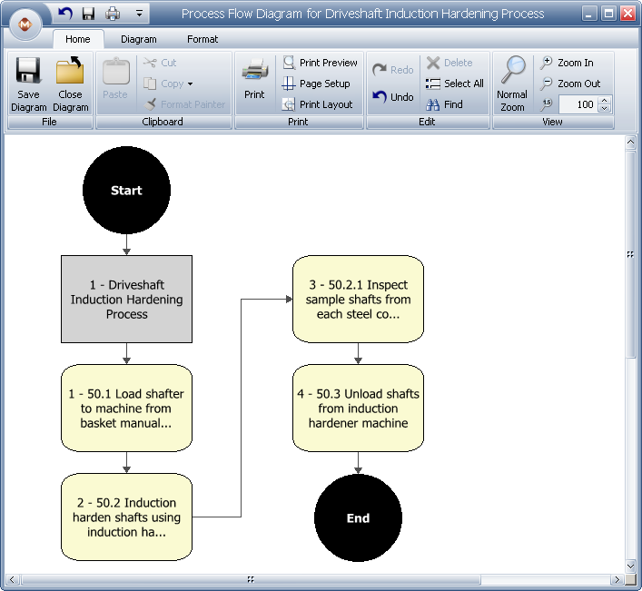 RCM++ allows you to create a process flow diagram for any item in the system hierarchy. Process flow diagrams are high level charts that help you to visualize the steps that a product goes through in a manufacturing or assembly process.