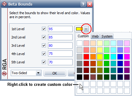 You can click the color field to define the line color for the beta bound. To add a new color to the Custom tab, right-click one of the color boxes in the bottom two rows.