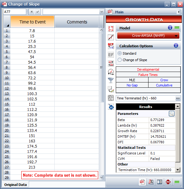 Note: The Change of Slope analysis requires at least three failures up to the break point and two failures after the break point (in the case of grouped data, this would be the number of intervals before and after the break point).