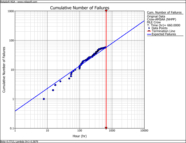 A system is put through a reliability growth testing program. A total of 58 failures are observed during the 660 hours of testing. The data are recorded in a Failure Times data sheet and analyzed with the Crow-AMSAA (NHPP) model, as shown next.