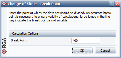 Return to the data sheet. In the Calculations Options area of the control panel, select the Change of Slope option, and then click the Calculate icon. This opens the Change of Slope - Break Point window, which allows you to specify the point at which the data set should be divided. Enter a value of 400, as shown next.