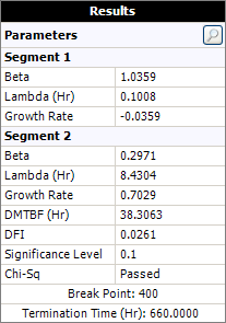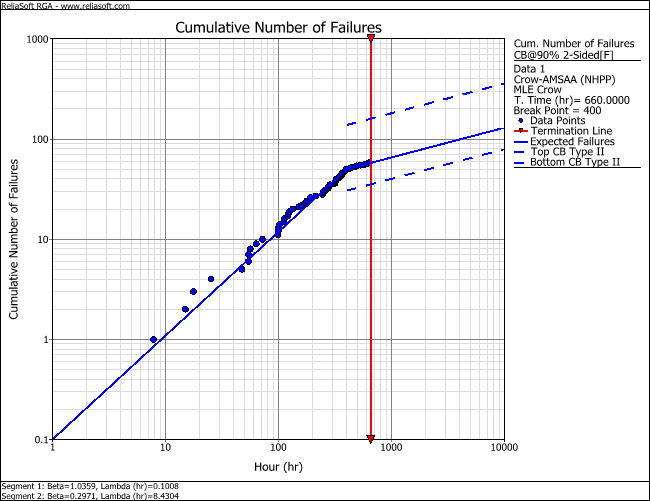 RGA automatically splits the data into two segments and fits a separate Crow-AMSAA (NHPP) model to each segment. For the first segment, the data points up to 400 hours are used to calculate its parameters. For the second segment, the data points after 400 hours plus information from the first segment are used to calculate its parameters.