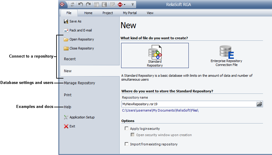 Use commands on the File menu (New, Recent or Open Repository) to create or open a repository (database). (See Database Types.)