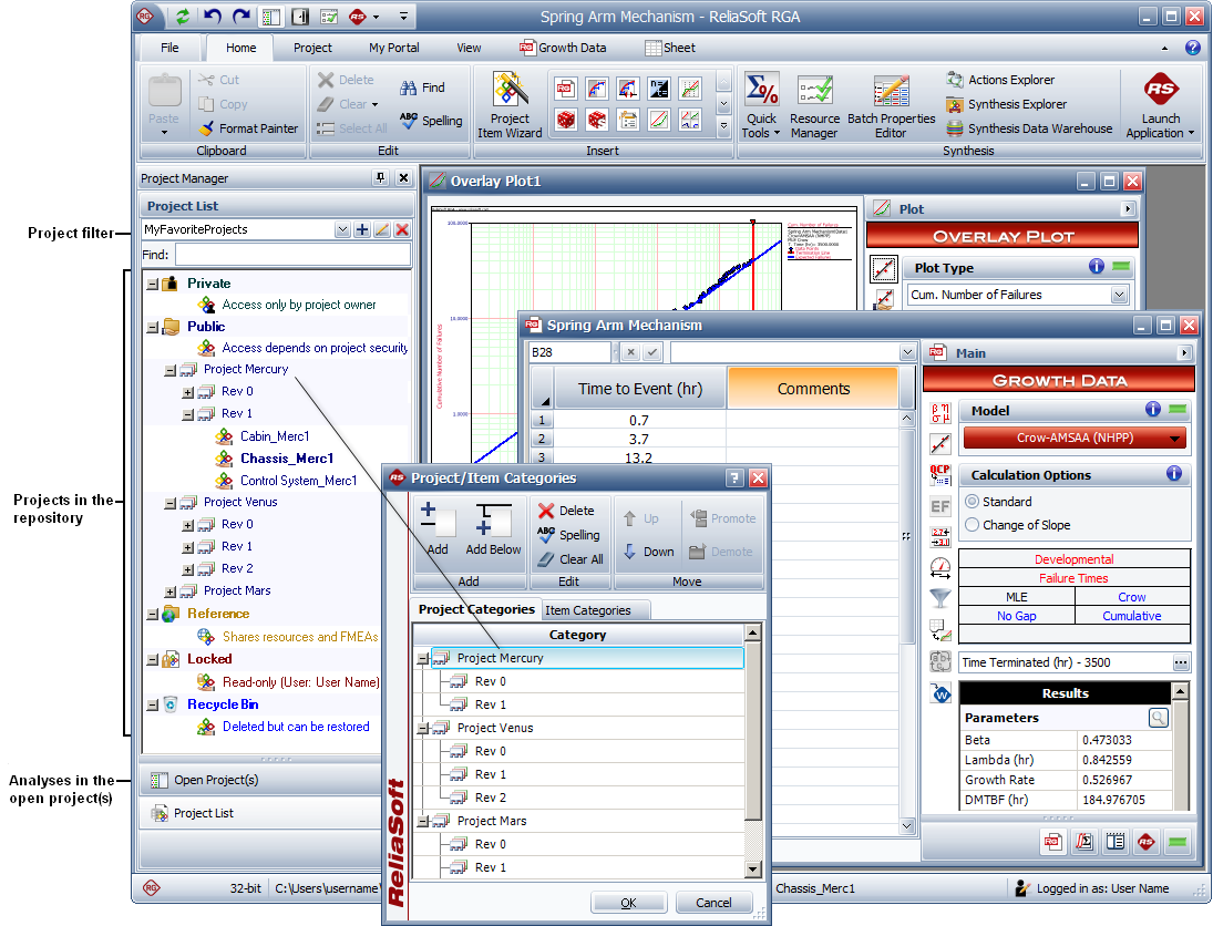 Common features such as project plans, resources and project attachments are visible in all ReliaSoft desktop applications.