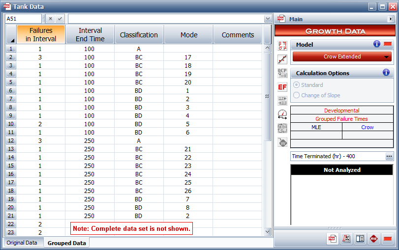 The "Tank Data" growth data folio contains the failure times observed during the test. The first data sheet (called "Original Data") contains the exact failure times. To create the second sheet (called "Grouped Data"), the analyst simply opened the original data sheet and clicked the Link Mission Profile icon on the control panel.