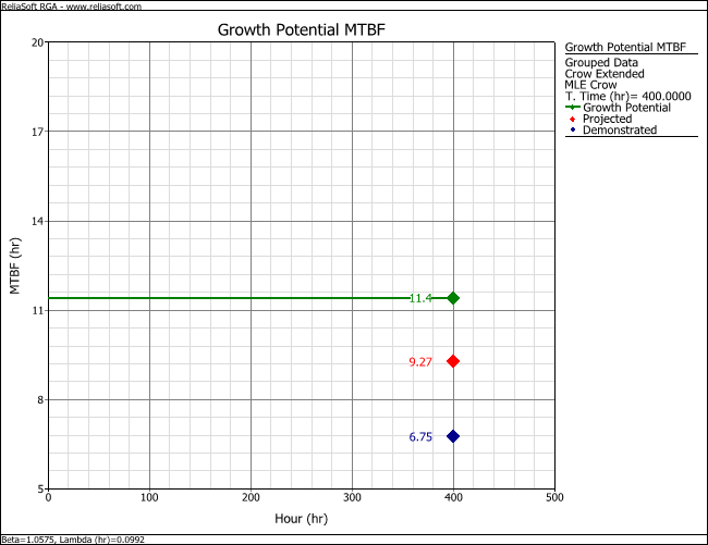 The following plot shows some useful planning metrics obtained from the grouped data analysis with the Crow Extended model: the demonstrated, projected and growth potential MTBFs.