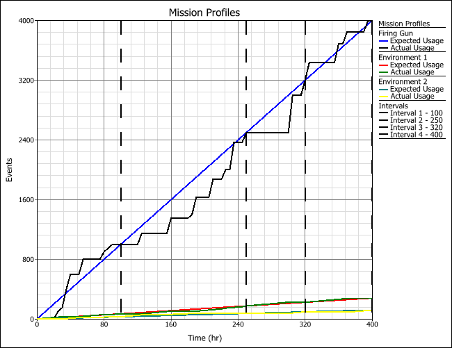 The mission profile folio called "Tank Testing Profile" shows the actual and expected usage for all three tasks. As shown next, the plot shows all three planned mission profiles together with the actual usage during the test. For example, the straight blue line shows the planned usage for the gun firing task and the jagged black line shows the actual usage during the test. You can see that the actual usage tends to fluctuate around the plan (due to normal variations under actual test conditions), but always meet the target at each of the four convergence points. The same applies for the actual usage on the environment 1 and environment 2 tasks.