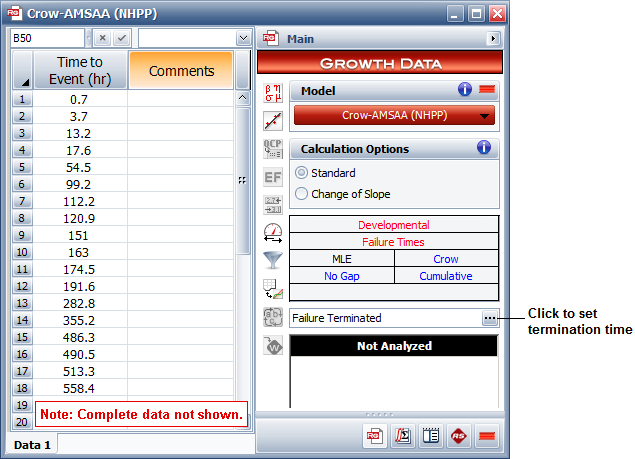 On the control panel, choose the Crow-AMSAA (NHPP) model, and then analyze the data by choosing Growth Data > Analysis > Calculate or by clicking the icon on the Main page of the control panel.