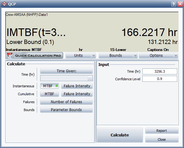 You can use the Quick Calculation Pad (QCP) to obtain the 90% confidence bounds on the demonstrated MTBF. To access the QCP, choose Growth Data > Analysis > Quick Calculation Pad or click the icon on the Main page of the control panel.