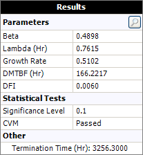 The results show a demonstrated MTBF (DMTBF) = 166.2217 hours at the end of the test, as shown next.