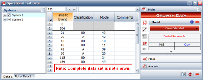 The data from the test are recorded in a Repairable data sheet with the Crow Extended model selected. Modes classified as "A" are not addressed, and "BD" modes are addressed after the test. Numerical codes were used to identify each specific failure mode. Some of the data for System 1 (selected in the Systems panel on the left) are shown next.