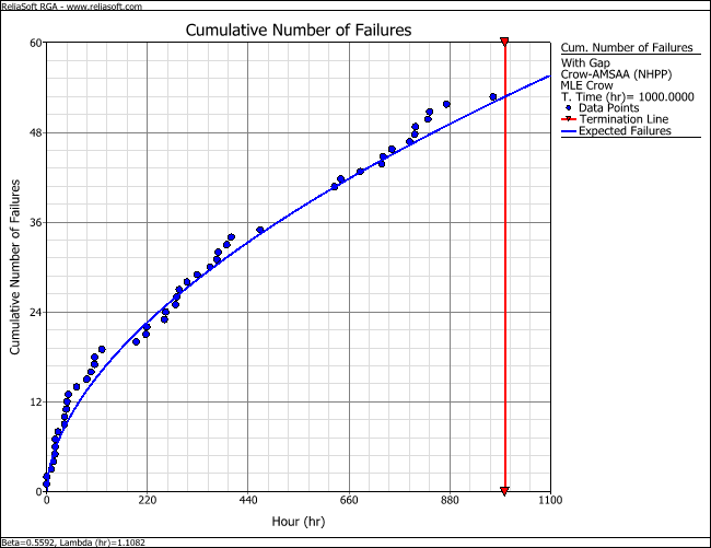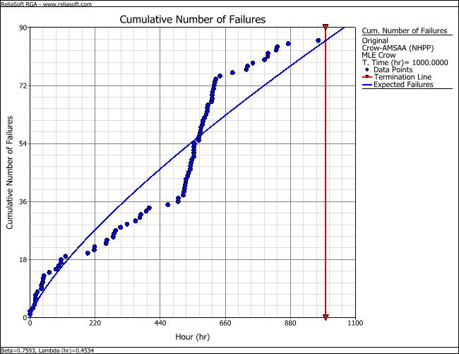 A system is put through a reliability growth testing program. The test is terminated after 1,000 hours of testing, and a total of 86 failures were observed during that period. The data are recorded in a Failure Times data sheet and analyzed with the Crow-AMSAA (NHPP) model, as shown next.