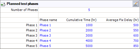 As an example, the following picture shows the inputs for a multi-phase test with 5 test phases that last 1,000 hours each. In the first phase, the planners estimate that delayed fixes (for BD failure modes) will, on average, take 500 hours each. The fix time is expected to increase in later phases.