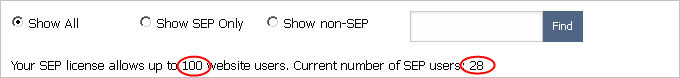 Once user accounts have been created for the desktop application(s), you can use the SEP Admin page to specify who can access the web portal. (See Managing User Accounts.) Scroll down to the Select SEP Users section and select any user accounts that will have access to SEP. Check the counters above the user table to determine how many more SEP users are allowed under your current license.