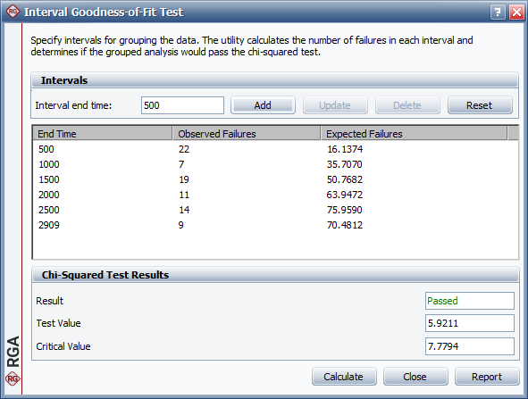 The Interval Goodness-of-Fit Test window helps you to group failure times into intervals so that the chi-squared goodness-of-fit test will pass when you analyze the grouped data. You specify the intervals that you are considering and the tool automatically determines the actual number of failures that were observed at the specified intervals and the number of expected failures based on the Crow AMSAA (NHPP) model. It then compares the observed vs. expected number of failures in order to evaluate how well the Crow-AMSAA (NHPP) model will fit the data when grouped into the proposed intervals.