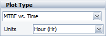 In the Multi-Phase Plot window’s control panel, the Plot Type drop-down list allows you to select whether the plot will display the mean time between failures (MTBF) or failure intensity, while the Units drop-down list allows you to select the units, which are defined at the database level.