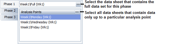 To select the data sheets for the analysis points, click the (...) button in the Analysis Points bar. In the Select Data Sheets window that opens, select the check box for all the data sheets that contains analysis point data for the current phase.