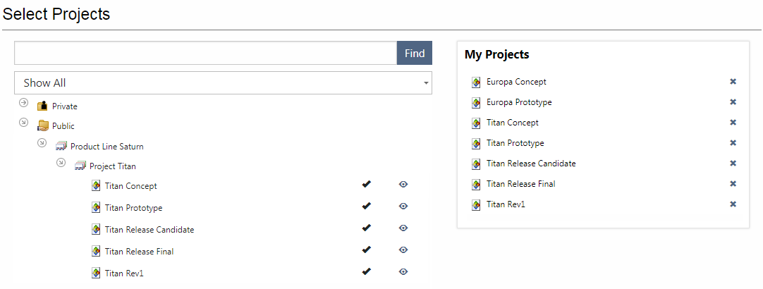 To add or remove projects from this list, click Select Projects. In the Select Projects popup window, the right side shows your list of projects and the left side shows all the projects that you have permission to view.