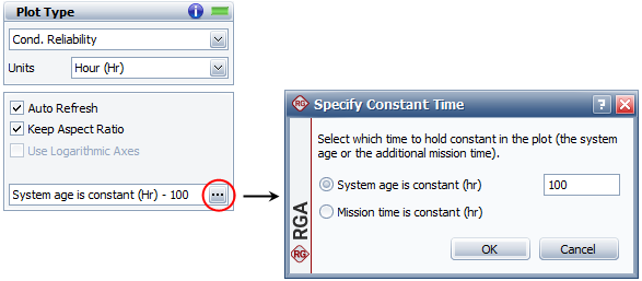 If you choose to hold mission time constant, the plots will show the reliability/unreliability for different system ages. For example, assuming that the mission will be 100 hours, the plot can show the reliability for a system that has already operated for 10 hours, 20 hours, 30 hours, etc.