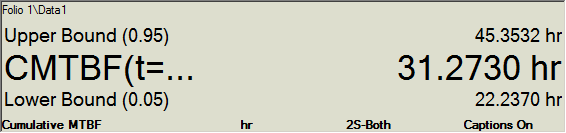 Select Captions if you want additional information to be displayed in the results area along with the values (a green light in the button indicates that this option is selected). For example, if you have selected to calculate the cumulative MTBF for a given time with 2-sided confidence bounds at the 90% confidence level, the first picture shows the display with captions and the second picture shows without.