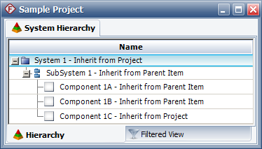 For a quick way to reset all of the item permissions to the defaults, you can open the Item Permissions window for SubSystem 1, set to Inherit from parent item and select the Apply to all dependents check box. The resulting system hierarchy is shown next.