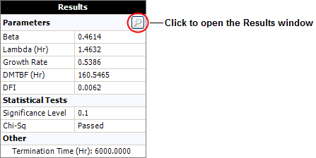 The growth data folio control panel allows you to configure the analysis settings for the data sheet and view/access the results. This topic provides general information that applies to most analyses. For more focused information about performing a particular type of analysis, you can go directly to the topic of interest. (See Traditional Reliability Growth Analysis, Growth Projections, Planning and Management (Crow Extended Model) or Repairable Systems Analysis.)