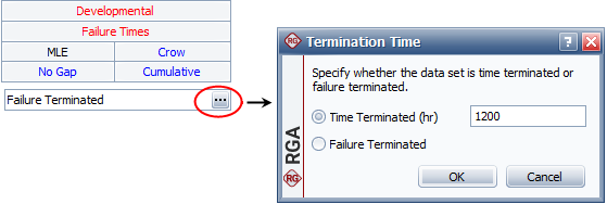This setting allows you to specify the time when the observation period ended, if applicable. Click the (...) button to open the Termination Time window, as shown next. Select the Time Terminated option to enter the actual observation time, or select the Failure Terminated option to indicate that the observation period ended with the last failure time recorded in the data sheet.