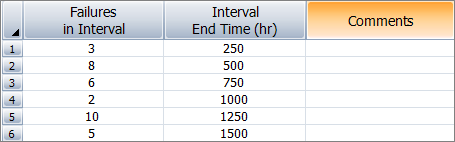 The Interval End Time column is for recording the times that an interval ended. The times are cumulative (where each row shows the total amount of test time accumulated by the end of each interval). The Failures in Interval column is for recording the number of failures that occurred in each interval. The failure numbers are non-cumulative (where each row shows the number of failures that occurred in that interval only). (See Cumulative vs. Non-Cumulative Data.)