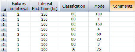 When you use the Crow-AMSAA (NHPP) or Duane model, the assumption is that fixes are applied when failures are found; therefore, each row in the data sheet will represent a different design configuration. Alternatively, when you use the Crow Extended model, you assume that different fix strategies are used for different failure modes (i.e., A = no fix, BC = fixed during test or BD = delayed fix). You will be required to identify and classify the failure mode responsible for each failure, as well as specify the effectiveness factor for each delayed fix (see Failure Mode Classifications).
