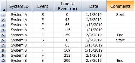 With this data type, you can enter the data in the Normal View or Advanced Systems View. The following example shows the Normal View. The System ID column is for recording the ID of the system that the data point relates to. The Event column specifies whether the row represents the start time (S), failure time (F) or end time (E) of the system. The Time to Event column is for recording the total cumulative test time when the specified event occurred.