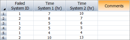 The following data sheet shows an example in which the times are cumulative. The first failure occurred for System 1 (indicated by a 1 in the first column for row 1). At that point, the operating times for both systems were recorded — 7 hours for System 1 and 10 hours for System 2 — and the same fix was applied on both systems. The next failure occurred for System 2 (indicated by a 2 in the first column for row 2). Once again, the operating times for both systems were recorded — 15 hours for System 1 (8 since the last event) and 17 hours for System 2 (7 since the last event). The rest of the data can be interpreted in a similar manner.