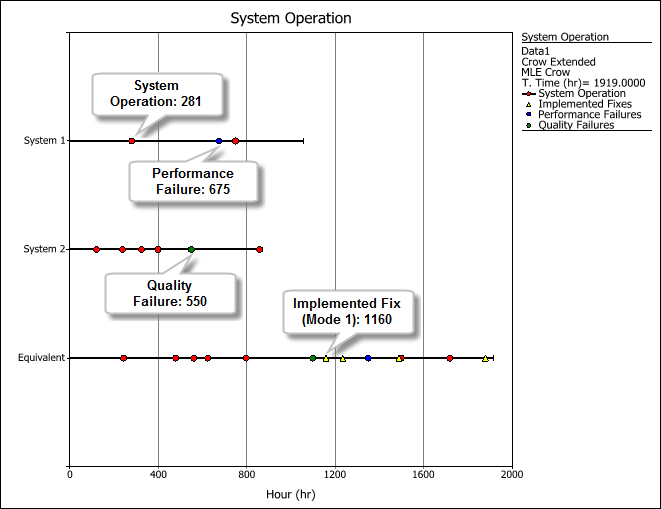 In this case, the process of combining the data set for the equivalent system is the same as described above for the Concurrent Operating Times data sheet, but with the addition of taking into account the time of implemented fixes across different systems. The implemented fix time is obtained by computing for the total time that the system spent in the same design configuration for a particular mode before the implemented fix took place. For these plots, the different types of events are shown in different colors: failure (red circle), implemented fix (yellow triangle), performance failure (blue circle) and quality failure (green diamond).