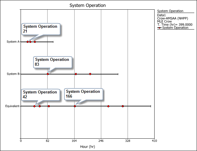 The following plot shows the failure times of both systems in the example, along with the timeline for their equivalent system. When the first failure occurred at 21 hours (System A), the total operating time for the test (represented by the equivalent system) is 42 hours because there are two systems running concurrently. In other words, the analysis multiplies the failure time of the failed system by the total number of systems in the test to obtain the equivalent operating time. Similarly, the first failure of System B (at 83 hours) is shown in the equivalent system as occurring at 166 hours.