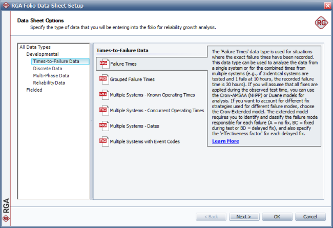 RGA’s growth data folio supports traditional reliability growth analysis, repairable systems analysis and reliability growth projections. The data type you select determines the type of analysis you can perform.