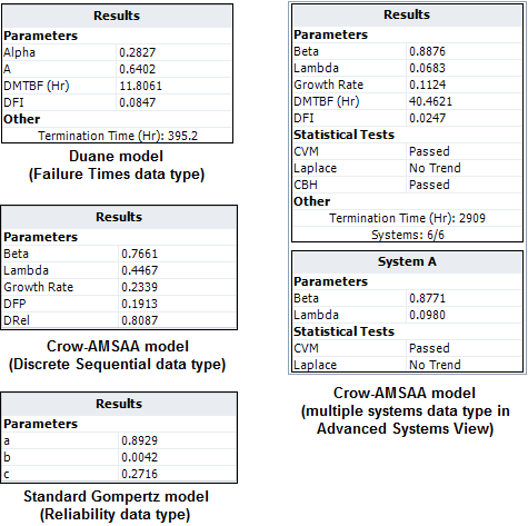The estimated parameters of the model are always displayed. For example, this will be a, b and c for Standard Gompertz; A and Alpha for Duane; Beta and Lambda for Crow-AMSAA; etc.