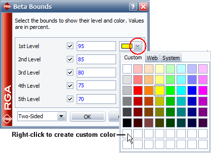 You can click the color field to define the line color for the beta bound. To add a new color to the Custom tab, right-click one of the color boxes in the bottom two rows.