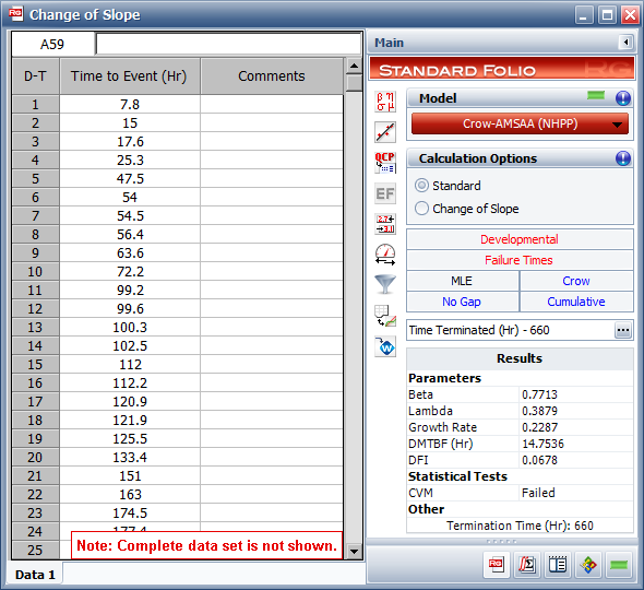 Note: The Change of Slope analysis requires at least three failures up to the break point and two failures after the break point (in the case of grouped data, this would be the number of intervals before and after the break point).