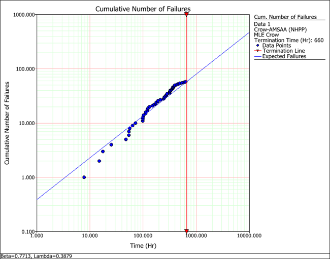 A system is put through a reliability growth testing program. A total of 58 failures are observed during the 660 hours of testing. The data are recorded in a Failure Times data sheet and analyzed with the Crow-AMSAA (NHPP) model, as shown next.