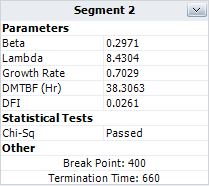 The following results show the estimated parameters for Segment 2. Based on this model, the demonstrated MTBF (DMTBF) of the system at the end of the test is 38.3063 hours. (The Segment 1 model can be used to calculate the MTBF for times up to 400 hours only.) The results also show that the data set has passed the chi-squared goodness of fit test.