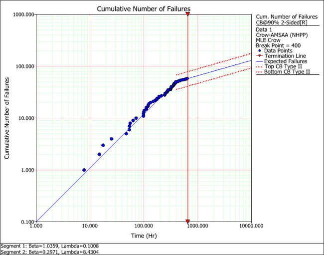 RGA automatically splits the data into two segments and fits a separate Crow-AMSAA (NHPP) model to each segment. For the first segment, the data points up to 400 hours are used to calculate its parameters. For the second segment, the data points after 400 hours plus information from the first segment are used to calculate its parameters.