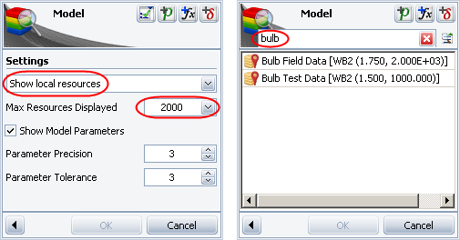 In addition, for model resources only, you must specify whether you want to display the model parameters in the list (which also takes longer to load); and if so, the number of decimal places (called Parameter Precision) and the point at which the software will switch to scientific notation (called Parameter Tolerance).