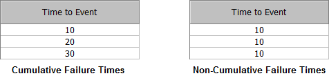 If the data sheet is configured for cumulative data entry, each failure time represents the total amount of operating time until the failure. If the data sheet is configured for non-cumulative data entry, each failure time represents the incremental amount of operating time since the last failure.