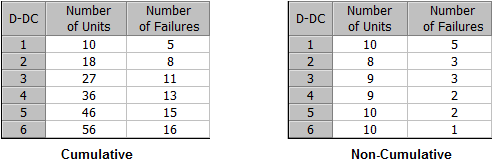 When applicable, this option also applies to the data entry for number of trials and number of failures. For example, in the following data sheets (Discrete Data: Grouped per Configuration), the left picture shows the cumulative data entry and the right picture shows the non-cumulative.