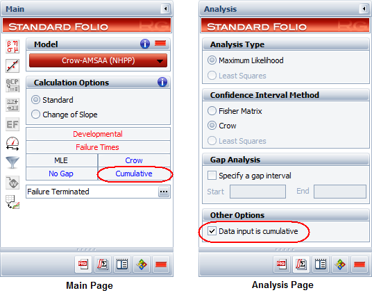 You can specify whether the values are cumulative or non-cumulative by clicking the blue text on the Main page of the control panel, or by selecting the Data input is cumulative check box on the Analysis page of the control panel. As an example, the following pictures show these two options for the Failure Times data type.